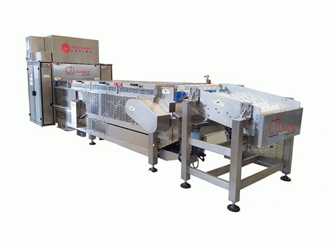 Qui sopra, è raffigurata la MultiFuit Coring. Questa macchina è in grado di rimuovere il nucleo contenente il nocciolo e suoi frammenti, alla velocità di 320 frutti al minuto. Grazie al sistema di orientamento continuo, la macchina posiziona automaticamente il frutto, in modo che da rimuovere il torsolo correttamente.
