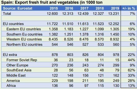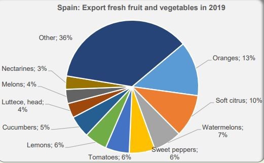 La Spagna è il più importante Paese al mondo nell'esportazione di frutta e verdura fresca. L'anno scorso ne ha esportato una quantità record, raggiungendo 13,2 milioni di tonnellate, per un controvalore di 13,5 miliardi di euro. In termini di quantità, è il sette per cento in più rispetto al 2018. Poco meno del 93% dei prodotti ortofrutticoli spagnoli viene inviato nei Paesi dell'Unione Europea (UE).
