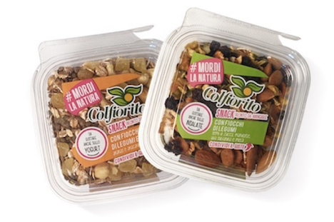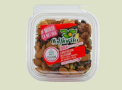 Le mele e le albicocche sono da agricoltura europea; le mandorle, a secondo della disponibilità, sono di filiera italiana o spagnola, mentre i mirtilli disidratati e altre tipologie di frutta secca sono di provenienza Usa. Prodotti selezionati certificati BRC, IFS, ISO9001, ISO22005, Bio, che devono invogliare il consumatore alla vista e poi al palato. Ecco perché vengono proposti in una pratica vaschetta trasparente, in formato da 200 gr.