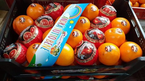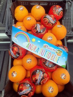 Nel frattempo, Michele ha colto l'occasione di una composizione realizzata dai suoi nipoti come augurio di ripresa dopo la pandemia, per realizzare una striscia stampata da abbinare alle cassette di arance, in modo che il messaggio di speranza si diffonda insieme al prodotto.