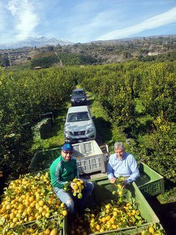 Nelle foto: raccolta dei limoni (a sinistra) e delle arance (a destra).