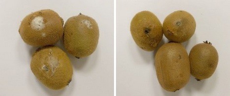 A sinistra: kiwi con lesioni in fase di raccolta: proliferazione di muffe contaminanti e maturazione precoce durante la fase di frigoconservazione, in assenza di ozono. A destra: stesso prodotto in frigoconservazione con atmosfera di ozono - effetto cicatrizzante sulle lesioni superficiali e assenza di muffe contaminanti.