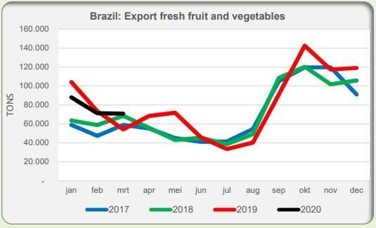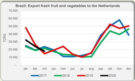 Nel primo trimestre del 2020, non c’è stata molta differenza nei volumi delle esportazioni di frutta e verdura dal Brasile ai Paesi Bassi, rispetto ai primi tre mesi del 2019. Tuttavia, è cambiata la distribuzione nel corso dei mesi. A gennaio, per esempio, è stato esportato molto meno rispetto al gennaio dell'anno scorso. A febbraio un po' meno, mentre a marzo il volume esportato è aumentato. Complessivamente, nel primo trimestre le esportazioni totali sono state di 230.000 tonnellate.