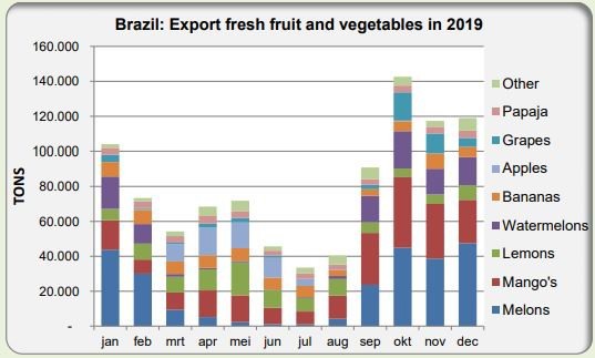 I volumi sono quasi uguali a quelli dello scorso anno mentre, rispetto al primo trimestre del 2018, sono molti di più. Il momento clou delle esportazioni brasiliane di frutta e verdura è nell'ultimo trimestre dell'anno. Complessivamente, il Brasile ha esportato quasi un milione di tonnellate di ortofrutta, principalmente frutta fresca. Il Brasile si colloca tra i 25 e i 30 principali Paesi al mondo nell'export di frutta.