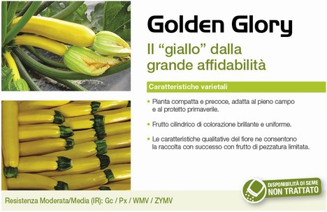 La varietà è stata accolta con successo e da subito si è affermata come leader nel segmento dello zucchino giallo. A livello agronomico Golden Glory si distingue per il portamento di pianta, la qualità merceologica e i pregi estetici e qualitativi del frutto, che sono di forma regolare, di un bel colore giallo brillante e distintivo. A livello organolettico la varietà eccelle per la sua gradevolezza di gusto e la sua dolcezza grazie all'elevato contenuto zuccherino.