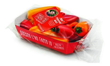 La confezione è in vassoio di cartone, riciclabile al 100%, nella raccolta differenziata della carta. All'interno della confezione, una ricetta è 'firmata' dal volto del socio, il suo nome, la località dell'azienda agricola e una ricetta dedicata: mini peperoni al forno, ripieni di feta, al profumo di timo. I mini peperoni dolci sono in vendita dal mese di giugno, fino a ottobre.