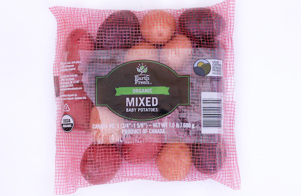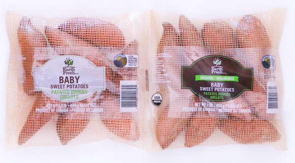 Il mix biologico di baby patate della EarthFresh da 680 grammi, le baby patate dolci biologiche da 450 grammi e le baby batate da 680 g sono ora vendute in una nuova confezione retinata a base biologica.