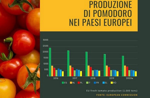 "La produzione di pomodoro fresco - si legge nel rapporto della Commissione che può essere scaricato qui - dovrebbe diminuire di 2 punti percentuali nel 2020, a causa di un calo di produzione del 7% in Spagna, che è il primo paese produttore in Europa".