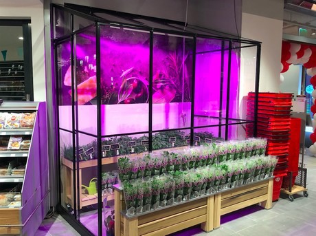La camera annovera illuminazione a LED viola e i contenitori dove sono posizionate le erbe aromatiche sono impilati uno sull'altro. Questa può essere considerata, senza dubbio, vertical farming: il concept sta guadagnando sempre più popolarità tra gli agricoltori, soprattutto quelli che coltivano erbe aromatiche, verdure in foglia, micro verdure e fiori eduli. Recentemente sono state condotte persino delle prove con i piccoli frutti.