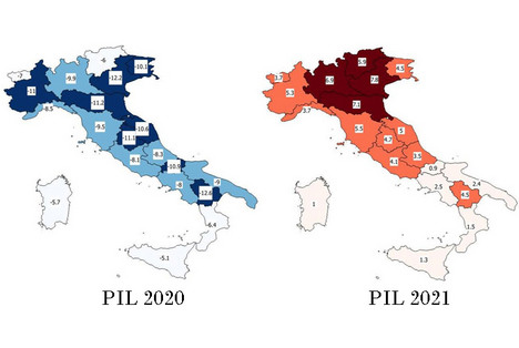 Il primato negativo del crollo del Pil nell'anno del Covid-19 spetta a una regione del Mezzogiorno e a una del Nord: la Basilicata (-12,6%), solo marginalmente interessata dalla pandemia, e il Veneto (-12,2%), una delle regioni maggiormente colpite dal virus.