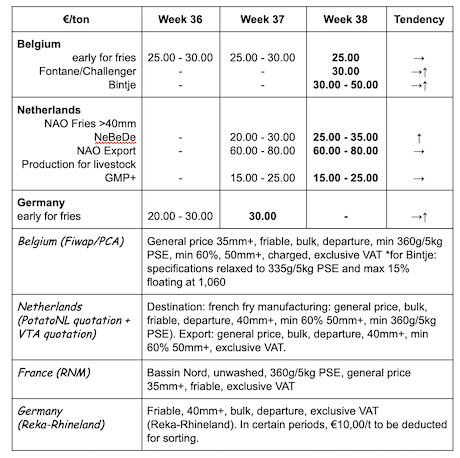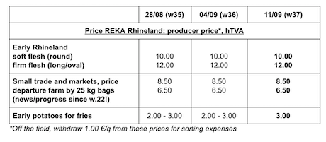 La raccolta delle patate precoci sta giungendo al termine e la scavatura delle varietà da stoccaggio è iniziata regolarmente nelle aree sabbiose, con irrigazione preventiva. Le condizioni di raccolta sono notevolmente peggiorate e alcuni lavori nei campi hanno dovuto essere interrotti. Le industrie sono poco interessate ai volumi liberi, che vengono reindirizzati verso mercati alternativi (bestiame, amido, biogas).