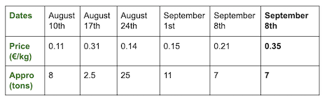 Prezzi ponderati (varietà rosse e bianche) all'asta Roeselare (fonte: REO via PCA):