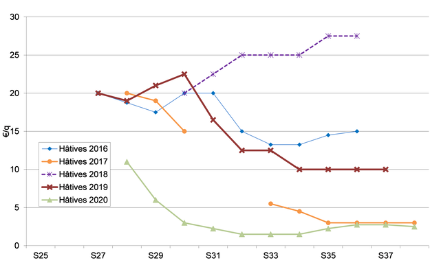 Dopo i buoni prezzi degli ultimi 2 anni, alcuni produttori biologici hanno aumentato le loro superfici coltivate e altri si sono convertiti al biologico. Nel 2019 sono stati seminati 10.100 ettari (800 ha in più rispetto al 2018), di cui 8.800 per il mercato del fresco (con varietà precoci). La tendenza della Grande distribuzione organizzata, orientata sul trend "locale e stagionale", è quella di favorire il più a lungo possibile le produzioni locali.