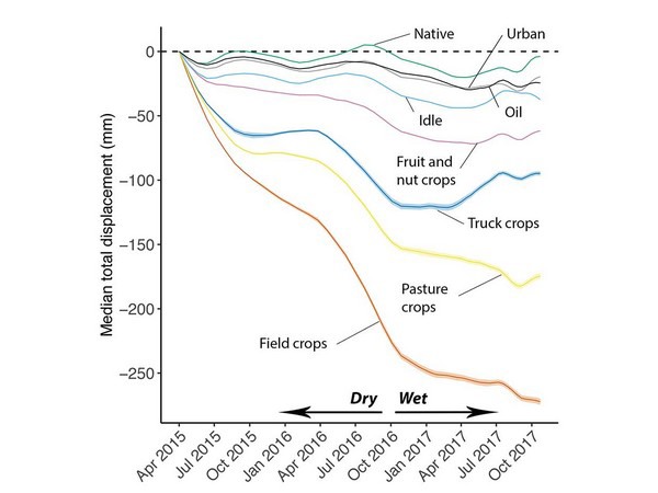 Lo studio, pubblicato sulla rivista Environmental Research Letters, ha sfruttato la risoluzione in scala ultra ridotta dell’InSAR per valutare i modelli di subsidenza in base al tipo di coltura, mostrando risultati sorprendenti. Ad esempio, nonostante i rapporti sull'elevato consumo di acqua in frutticoltura in California, i tipi di colture con i maggiori tassi di subsidenza e, per associazione, i maggiori tassi di utilizzo delle acque sotterranee, sono colture in pieno campo, come mais e soia, seguite da colture foraggere, come l'erba medica, colture orticole come i pomodori e, infine, colture frutticole come mandorle e uva da tavola.