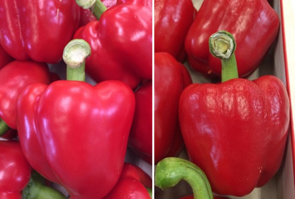 Risultati dei test sui peperoni quadrati utilizzando la tecnica di confezionamento PerfoTec & Oerlemans (a sinistra) e il metodo di confezionamento tradizionale (a destra), dopo 25 giorni a una temperatura di 5°C.
