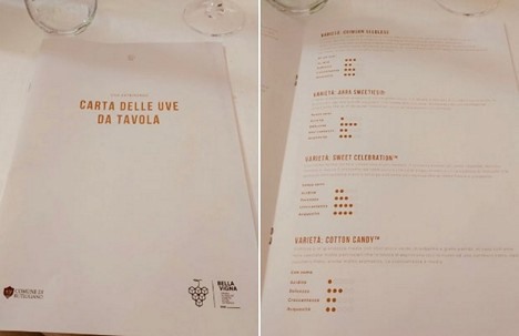 "Sulla carta sono elencate 20 varietà di uve, sia quelle senza semi sia quelle con semi, tra le più note sui mercati italiani ed esteri. Un'idea che potrebbe essere copiata anche nei punti vendita della Gdo. Sarebbe fantastico, infatti, se nel reparto ortofrutta ci fosse la carta delle uve da tavola: un modo per guidare il consumatore finale verso l'acquisto del prodotto che più si addice ai suoi gusti. Potrebbe diventare, dunque, uno strumento in più nelle mani dei consumatori, sempre più disorientati a causa della molteplicità di uve disponibili in vendita".
