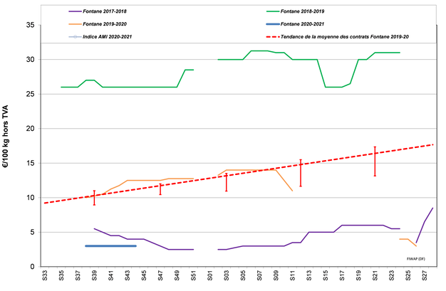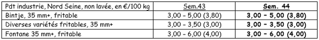 Patate da industria, sfuse, partenza, IVA esclusa, Senna-Nord, €/q, min-max (moy)(RNM):