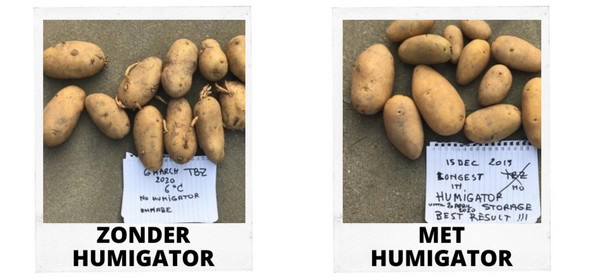 "Gli Humigator sono stati testati in laboratorio. Sono stati anche utilizzati con successo negli impianti di stoccaggio delle patate, senza strutture di ventilazione, e in altre aree che necessitano di essere umidificate. La macchina è anche molto facile da usare e necessita solo di elettricità e acqua. l'Humigator richiede pochissima manutenzione e può essere facilmente installato in qualsiasi magazzino di patate".