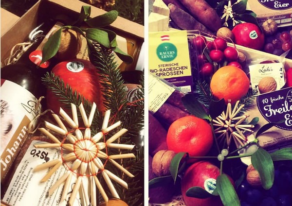 Le cassette di Natale di Windhaber avranno questo aspetto e conterranno carne, uova, olio di semi di zucca della Stiria e ovviamente una grande porzione di frutta, tra cui mele, uva, mandarini e noci.