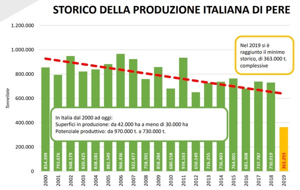Nel periodo 2000-2018, la produzione di pere in Italia ha registrato una progressiva tendenza alla diminuzione. Due annate successive, quelle del 2019 e del 2020, disastrose per la pomacea italiana per via della cimice asiatica e della maculatura bruna. Nel 2020, la quota dell'Italia rispetto al totale Ue è risalita al 28%.