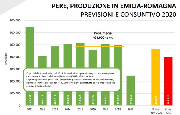 La prima previsione per il 2020, in Emilia-Romagna, dava i quantitativi su circa 464mila tonnellate, ridimensionati al di sotto delle 400mila tonnellate, soprattutto per le problematiche relative ad Abate Fetel.