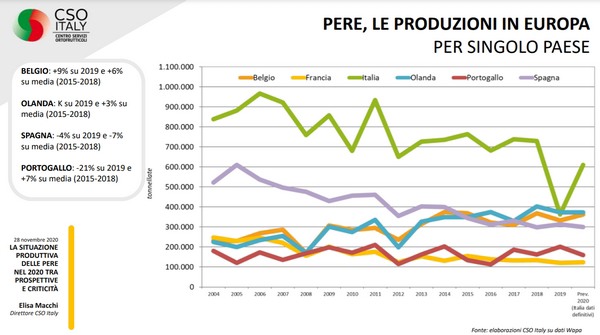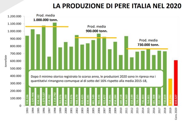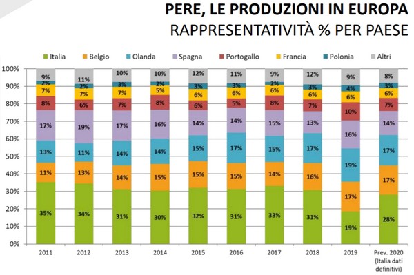 Nel periodo 2000-2018, la produzione di pere in Italia ha registrato una progressiva tendenza alla diminuzione. Due annate successive, quelle del 2019 e del 2020, disastrose per la pomacea italiana per via della cimice asiatica e della maculatura bruna. Nel 2020, la quota dell'Italia rispetto al totale Ue è risalita al 28%.