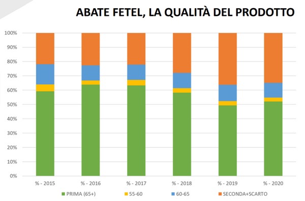 Il problema del marciume calicino ha ridotto sicuramente i volumi, ma ha anche avuto ripercussioni sulla qualità dei frutti, in particolare Abate Fetel. "Mediamente,se guardiamo alle annate precedenti - spiega Macchi - oltre il 60% dei conferimenti di pere Abate riguarda la I qualità. Nel 2019, questa percentuale si è fermata al 49% del totale e nel 2020 a poco oltre il 50%. Anche questo porta, di conseguenza, problemi economici per i produttori, in quanto il prodotto da immettere sul mercato risulta più difficile da valorizzare, essendoci meno frutti di I qualità".