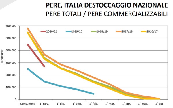 Ogni mese, il CSO monitora l'andamento delle vendite di pere, a livello nazionale e per la sola Emilia-Romagna. I dati, aggiornati al 1 novembre 2020, parlano di una percentuale di venduto sostanzialmente in linea con gli anni precedenti: il 39% del totale nella stagione 2020/21 contro il 41% della campagna precedente. La media del triennio 2016-2018 è stata del 39%.