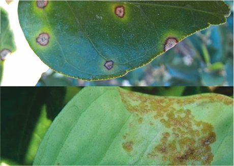 Nelle foto sopra: le lesioni sono in rilievo su entrambe le pagine fogliari ma maggiormente su quella inferiore. Le pustole, con il tempo, diventano suberose e crateriformi, con un margine sollevato. Spesso le lesioni sono circondate da un alone giallo (foto M. Caruso CREA-OFA, Italia e J. Cubero INIA Madrid, Spagna)