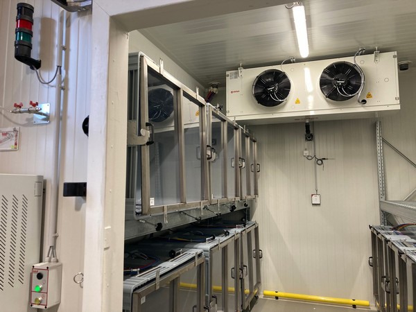 Isolcell ha eseguito tutti i lavori tecnici di raffreddamento e condizionamento dell'aria. "Abbiamo costruito tre celle refrigerate, dotate di pannelli, porte e un sistema di refrigerazione indiretta a glicole. In una cella frigorifera, ci sono 9 mini-cabinet a tenuta gas collegati a un collettore per le iniezioni automatiche di CO2, O2, N2 ed etilene. Questi sono collegati a mini-assorbitori per la CO2, a carbone attivo. In tutti i mini-cabinet è possibile creare un'atmosfera diversa con gestione automatica delle immissioni", dichiara Hubert Wieser, sales manager di Isolcell.