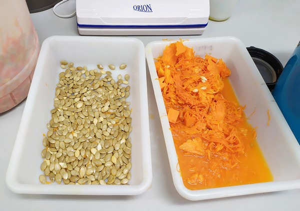 Semi di zucca mentre vengono separati dalla polpa