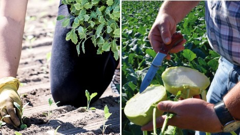 A sinistra: le verdure vengono piantate a mano. A destra: un cavolo rapa a metà