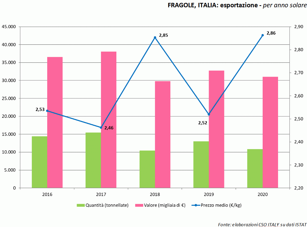 Le esportazioni di fragole italiane durante la stagione commerciale 2020 sono nuovamente diminuite rispetto ai buoni quantitativi inviati durante la campagna precedente, un volume di quasi 11.000 tonnellate, il -17% sul 2019. Anche il valore, con circa 31 milioni di euro, evidenzia un calo del 5% sull'annualità precedente.
