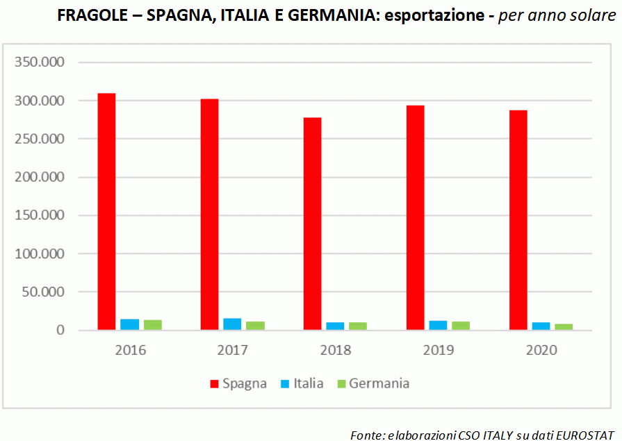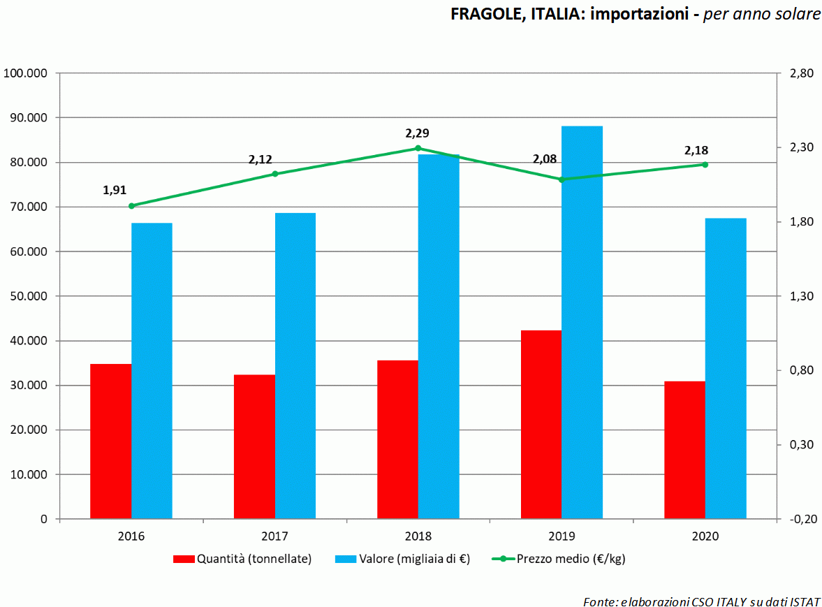 La quasi totalità delle fragole di importazione giungono dai Paesi dell'UE28. Nel 2020 sono arrivati poco più di 30.000 tonnellate, il 98% del totale in flessione di ventisette punti percentuali rispetto all'anno precedente. La Spagna tradizionalmente ne detiene il primato, durante l'ultima campagna ha coperto circa l'81% del complesso in calo del 28% sull'elevato 2019. Nel 2020 i volumi di fragole spagnole giunti nel nostro paese sono stati di circa 25.000 tonnellate, un volume simile a quello dell'annata 2017.