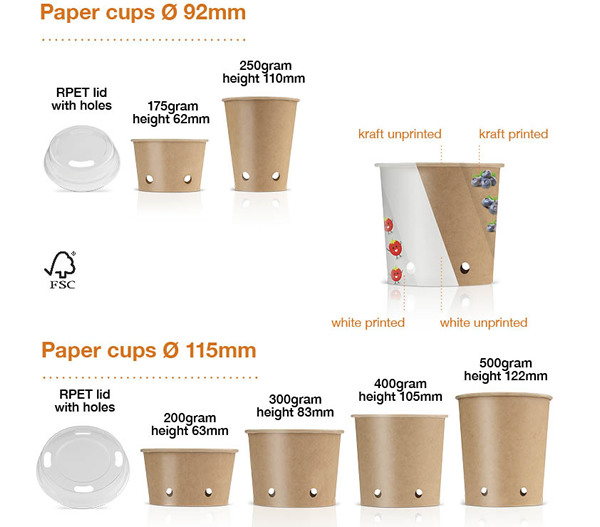 Nella serie di contenitori a secchiello sono disponibili varianti da 200, 300, 400 e 500 grammi. Il vantaggio di questa serie è che per ogni variante è possibile utilizzare lo stesso coperchio R-PET. Tutti i bicchieri sono disponibili in carta bianca o kraft, con o senza fori e possono essere stampati secondo le esigenze del cliente. Se richiesto, i bicchieri stampati possono essere consegnati entro 2 settimane.