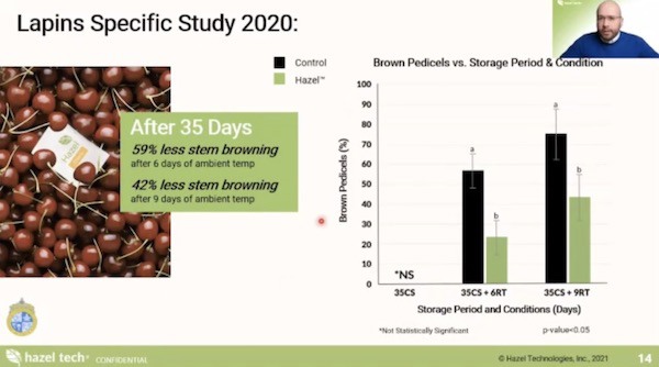 Cervantes ha parlato brevemente anche di alcuni trial condotti per valutare l'effetto della soluzioni della Hazel sulle ciliegie. "In uno studio condotto dall'Universidad Católica in Cile sulla varietà Sweetheart, si è scoperto che dopo 35 giorni nel magazzino refrigerato e 6 giorni a temperatura ambiente, si è avuto il 35% in meno di imbrunimento del gambo sulle ciliegie trattate con le bustine della Hazel, e dopo 9 giorni a temperatura ambiente il 28% in meno. I risultati di uno studio sulla varietà Lapin sono stati ancora migliori: il 59% in meno di imbrunimento del gambo dopo 6 giorni a temperatura ambiente, e il 42% in meno dopo 9 giorni, entrambi dopo 35 giorni nella cella refrigerata, prima dei giorni a temperatura ambiente".