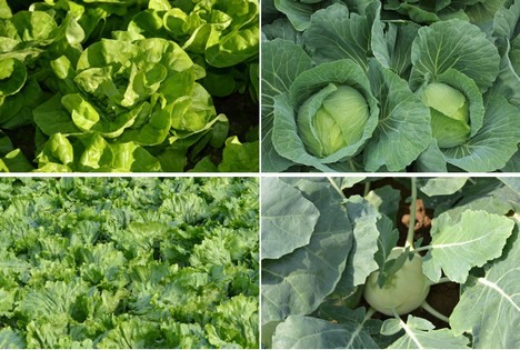 Le quattro principali colture da sinistra a destra: lattuga, cavolo cappuccio, cavolo rapa e lattuga iceberg. Secondo i piani, in estate l'azienda attiverà un capannone di 3.000 m2 per la trasformazione delle verdure.