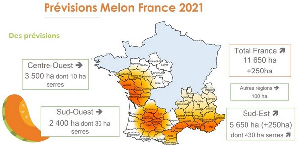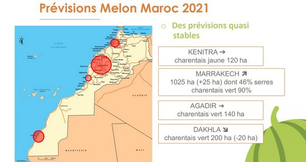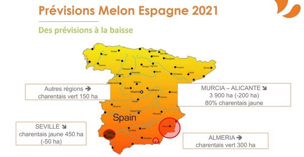 Un clima favorevole fino alla fine di marzo in Spagna ha permesso una buona semina, ma il clima freddo e umido (non paragonabile al 2020) ha portato a una graduale entrata in produzione. In Almeria superficie stabile per lo Charentais verde, coltivato in serra. A Siviglia, si è registrata una leggera diminuzione delle superfici, ma inferiore a quella dell'anno scorso, con una flessione su Malaga.