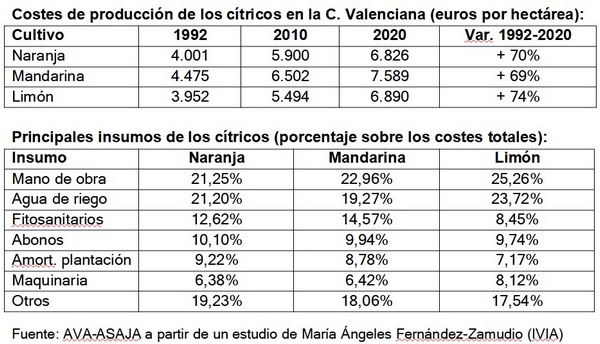 L'Associazione valenciana degli agricoltori (AVA-ASAJA) ha dichiarato che secondo i dati dello studio "La citricultura valenciana, la evolución de sus costes de producción e insumos que los determinan (L'industria agrumicola valenciana, evoluzione dei suoi costi di produzione e input)" pubblicato da Maria Angeles Fernandez-Zamudio dell'Istituto valenciano di ricerca agraria (IVIA) negli ultimi 30 anni i costi di produzione degli agrumi nella Comunità valenciana sono aumentati del 70% (1992-2020).
