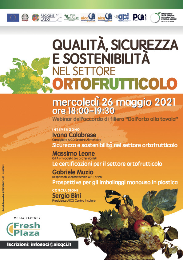 Durante l'evento digitale interverrà Ivana Calabrese, consigliere del Settore Alimentare dell'Associazione Italiana Cultura della Qualità, la quale parlerà di sicurezza e sostenibilità nel settore ortofrutticolo. Poi Massimo Leone, biologo di Q&A srl società tra professionisti, illustrerà i contenuti di un quaderno sulle certificazioni per il settore ortofrutticolo, pubblicato nell'ambito del progetto Dall'orto alla tavola.