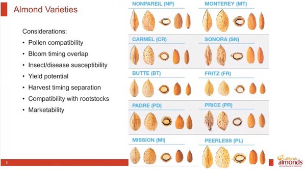 "Per scegliere una varietà, ci sono diversi fattori da considerare. Dal punto di vista del produttore si guarda a: compatibilità per l'impollinazione, sovrapposizione dei tempi di fioritura, suscettibilità a insetti e fitopatie, potenziale di resa, tempistiche di raccolta separate da varietà a varietà, compatibilità con i portinnesti e commerciabilità".