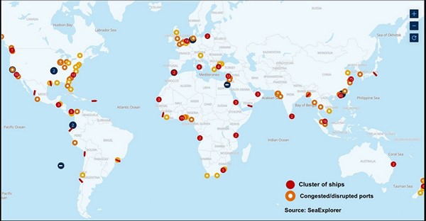 RM: I container restano nei terminal il meno possibile, per essere subito riutilizzati. Ce ne sono molti però "parcheggiati" in mare, nel senso che sono oltre 300 le navi portacontainer che, in questo momento, attendono all'ancora la possibilità di entrare in porti particolarmente congestionati. La cartina qui sotto spiega bene quali sono le aree più congestionate, dove si concentrano le navi in attesa di entrare in porto.
