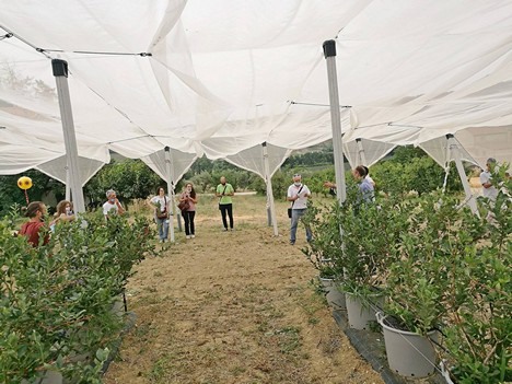 "Quest'anno abbiamo raggiunto 2 chilogrammi di mirtillo per pianta, ma la piena produzione l'avremo solo nel 2022". Così spiega Gianni Malavolta, dell'azienda Aso48 che ha sede nel territorio di Lapedona, in provincia di Fermo. Nei giorni scorsi, un nutrito gruppo di tecnici e agricoltori ha visitato l'azienda nell'ambito delle attività di divulgazione previste dal progetto PSR Misura 16.1.A.2 dal titolo "Soluzioni innovative per estendere la produzione e il calendario di maturazione di fragola e piccoli frutti nelle Marche".