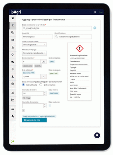 Grazie ad un database continuamente aggiornato, IoAgri ti guida nella registrazione dei trattamenti svolti. In particolare, suggerisce, in base all'avversità individuata (esempio: peronospera), le dosi minime e massime, l'intervallo di rientro e di sicurezza e il numero massimo dei trattamenti da effettuare rispettando le indicazioni dei fitofarmaci come da etichetta. Ed è fatto! Si potrà scaricare il registro dei trattamenti con un click.