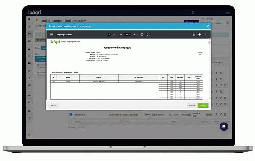 Non solo gestione economica e attività colturali, IoAgri offre la possibilità di stampare in tempo reale il quaderno di campagna a seconda del regime di conduzione dell'azienda, sempre nel rispetto delle normative vigenti.