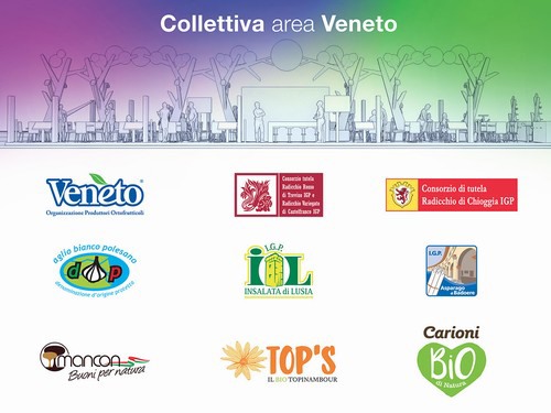 Partner della collettiva Veneto sono i Consorzi di tutela Radicchio rosso di Treviso IGP e Radicchio variegato di Castelfranco IGP, Radicchio di Chioggia IGP, Aglio bianco Polesano DOP, Insalata di Lusia IGP, Asparago bianco e verde di Badoere IGP, la Società Agricola Mancon con la gamma dei funghi e baby leaf, Top's "il bio topinambur" e Carioni con la sua gamma di prodotti 100% da agricoltura biologica. Special guest, La Giardiniera di Morgan con le croccanti e golose verdure prodotte da aziende agricole socie OPO Veneto.