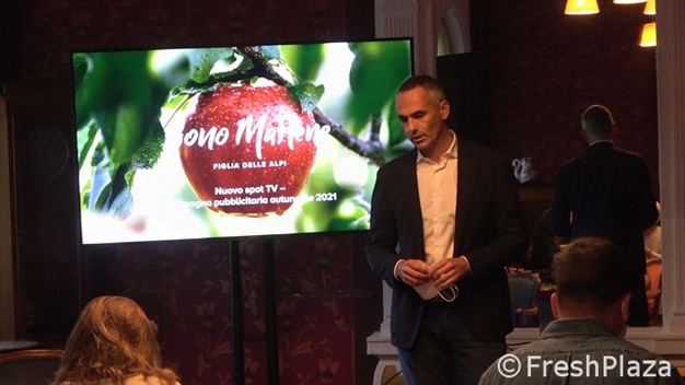 Una ventina di giornalisti italiani e spagnoli, solo un paio d'ore prima, aveva assistito in anteprima al nuovo spot del marchio presso lo storico Roter Salon di un albergo di Merano. E' grazie a un territorio protetto a nord da quelle vette delle Alpi Passirie, che sfiorano i 3500 metri, illuminato per più di duemila ore di sole l'anno, che si è potuta sviluppare la coltivazione della mela su oltre 18.400 ettari di terreno dedicati, la più grande area chiusa di coltivazione delle mele dell'Ue, che produce la metà del raccolto italiano.