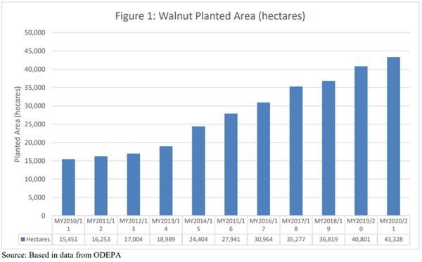 Per l'annata 2021/22 è stimata una produzione di noci pari a 152mila tonnellate, con un aumento del 2,7% rispetto alla campagna 2020/21 a seguito di un aumento della superficie coltivata. Le esportazioni di noci in guscio sono stimate a 150mila ton, valore che rappresenta un aumento del 3,4% rispetto alla stagione 2020/21.