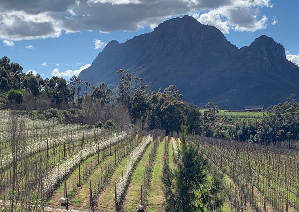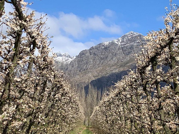 Frutteti di susine in fiore fuori Stellenbosch, all'inizio della scorsa primavera