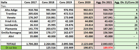 Il Comitato marketing ha analizzato anche la situazione del settore biologico, che arriva a 189.974 tonnellate di produzione, in perfetto allineamento con il 2020.
